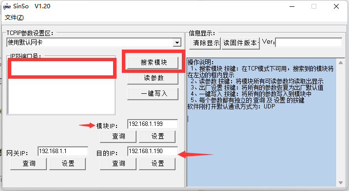 1、通過IP修改軟件:SinSo 232 V1.19/SinSo 232 V1.20工具,修改設(shè)備IP;