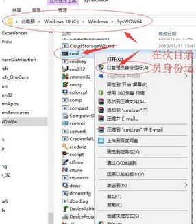1、在C:\Windows\SysWOW64\目錄下找到cmd.exe文件,對(duì)其單擊鼠標(biāo)右鍵,點(diǎn)擊選擇彈出菜單中的“以管理員身份運(yùn)行”,打開cmd