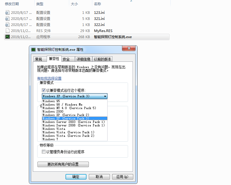 1、將控制軟件解壓后,光標(biāo)放在軟件圖標(biāo)上,點(diǎn)擊右鍵→屬性→兼容性,勾選當(dāng)前系統(tǒng)→應(yīng)用→確定