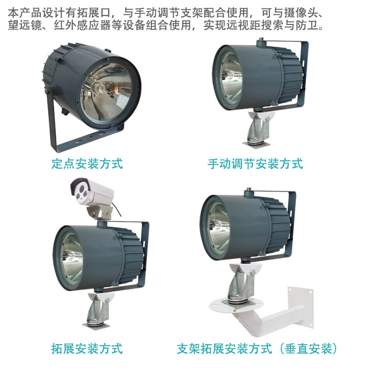 強(qiáng)光探照燈是一款專為戶外安防監(jiān)控領(lǐng)域開發(fā)設(shè)計(jì),廣泛應(yīng)用于國防,軍事(武警),司法(監(jiān)獄,看守所,勞教所,勞改農(nóng)場(chǎng)),水利(水閘,水庫,水電站,水文站)電力等部門,以及大型工礦企業(yè),大型工程施工場(chǎng)地,油田,鋼鐵廠,飛機(jī)場(chǎng),碼頭,海上或野外搜索 搜救等場(chǎng)所。