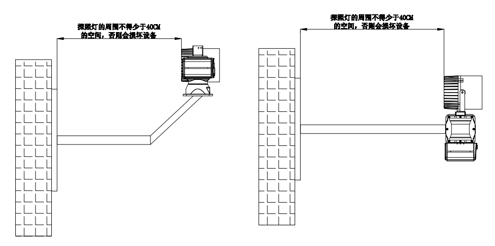 *警告:采用壁裝支架安裝時,云臺探照燈與墻壁之間的距離不得少于40cm,否則有可能使云臺探照燈與墻壁碰撞導(dǎo)致?lián)p壞。