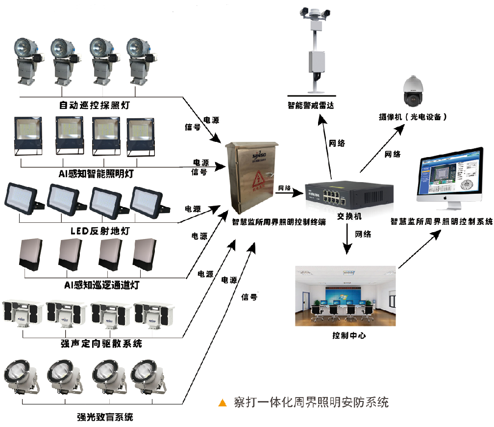 察打一體化周界照明安防系統(tǒng)由:超腦網(wǎng)絡(luò)探照燈、AI感知智能照明燈、警戒區(qū)專用LED反射地?zé)簟I感知巡邏通道燈、強聲定向驅(qū)散系統(tǒng)、強光致盲系統(tǒng)、智慧監(jiān)所周界照明控制終端、智慧監(jiān)所周界照明控制系統(tǒng)所構(gòu)成。